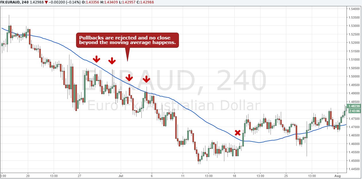 Pullbacks into moving averages are very quick and price does not stay long at a moving average