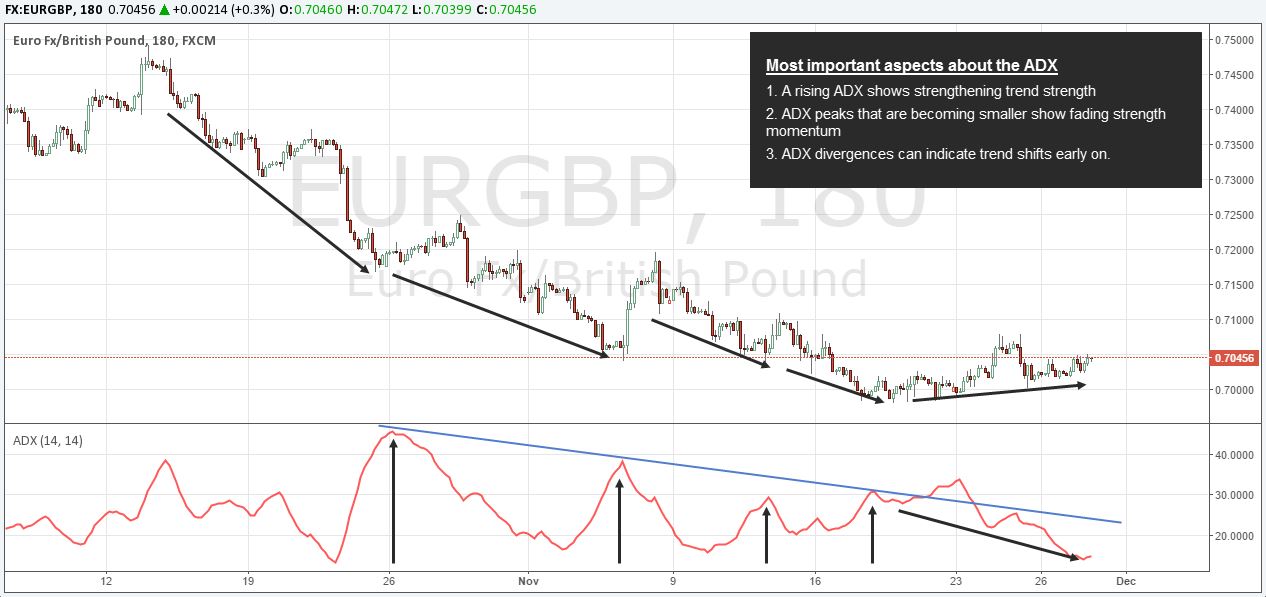 The ADX measures trend strength and it is non-directional which means that it cannot tell you which direction price is going – it only tells you if the trend is gaining or losing momentum.