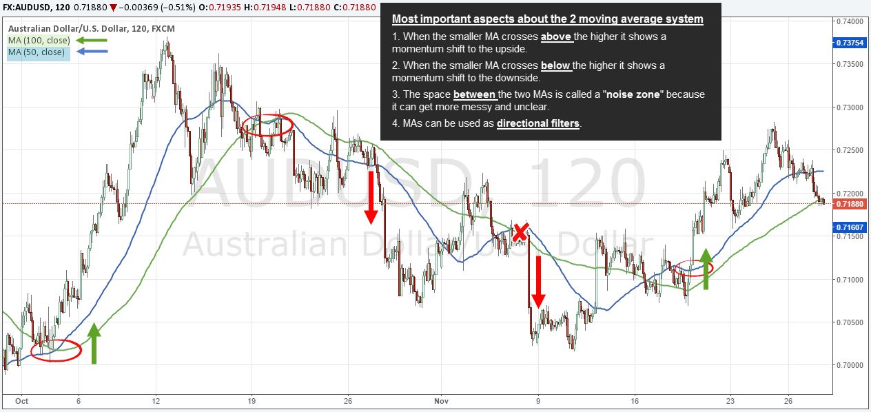 The combination of a smaller and a larger moving average measures sentiment shifts in price. The screenshot below shows a chart with a 50 and a 100 MA. When the small MA crossed above the larger MA it signaled a shift in sentiment to the upside because recent prices were moving above the average of the longer term price structure. Conversely, when the shorter MA crossed the larger MA it signaled a sentiment change to the downside because recent price started trading below the longer-term average.