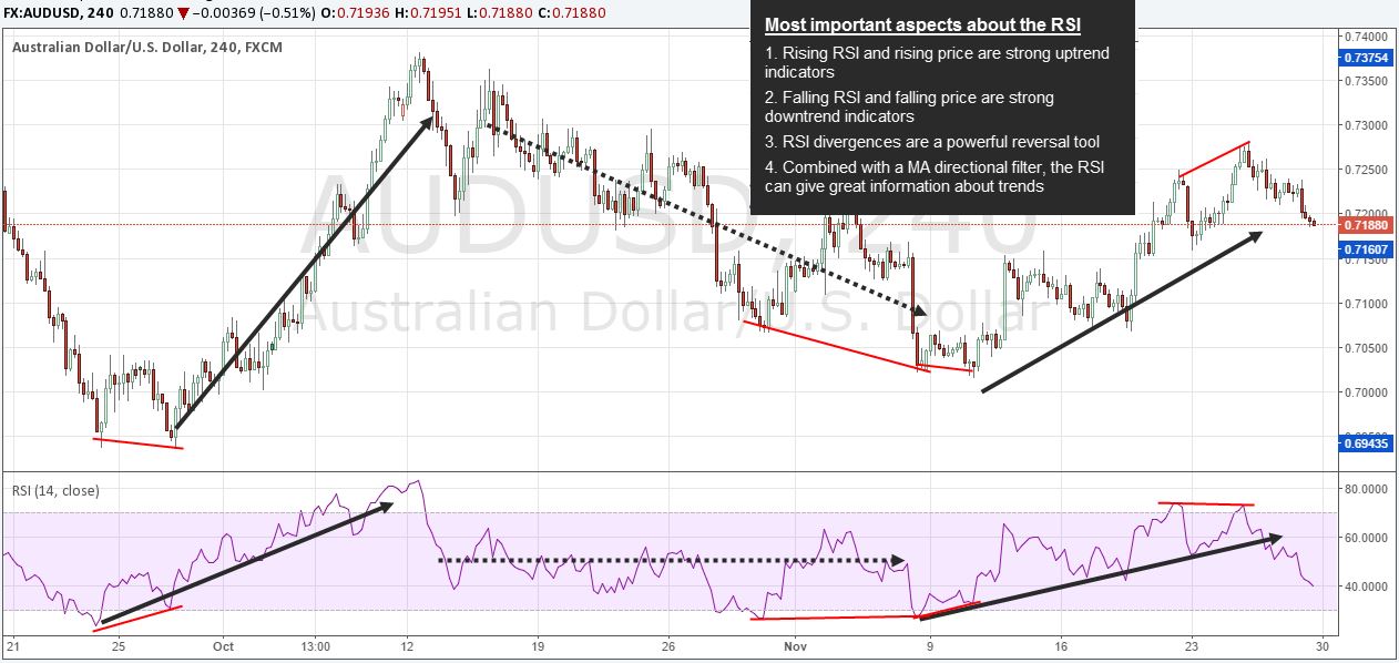 The RSI is another indicator that measures strength. It is similar to the ADX but the RSI is directional. In a healthy uptrend, the RSI makes new highs and higher lows. In a downtrend, the RSI makes new lows and lower highs. In a range environment, the RSI moves sideways between 30 and 70.