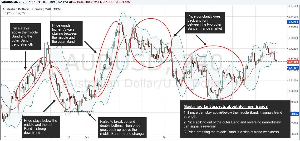A price spike through the outer bands and an immediate reversal indicates a sentiment shift
