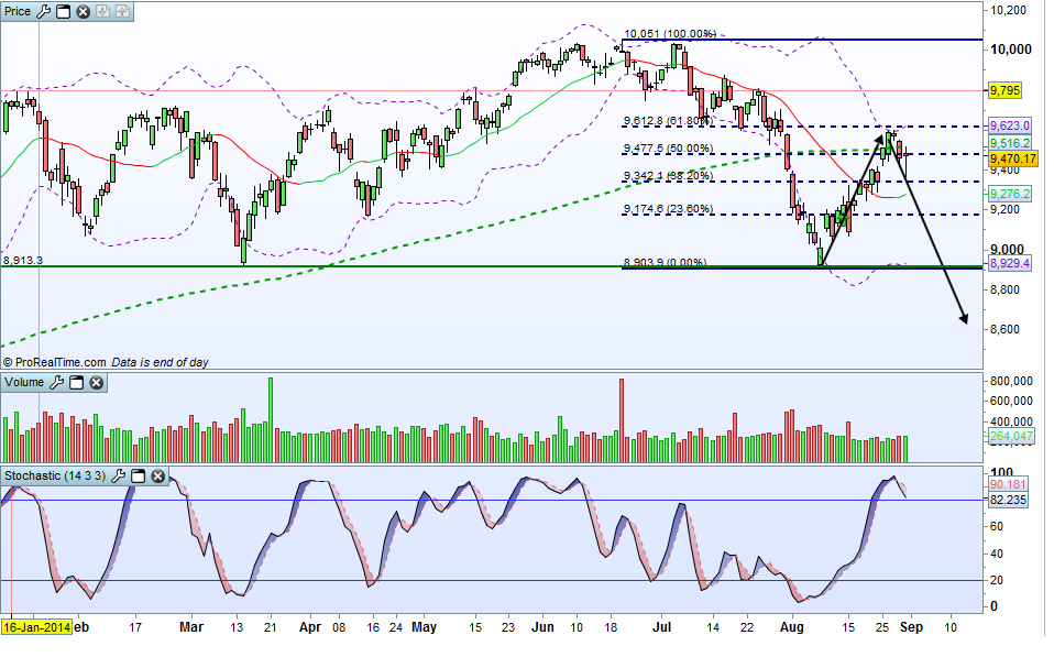 recomenda-se atenção agora aos 9700. podemos ter nos proximos dias novo passo dado para a confirmação de inversão de tendência no DAX.