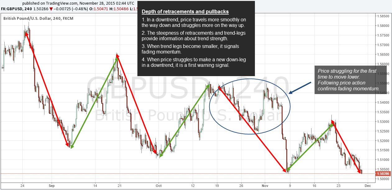he first point lays the groundwork for all that follows and it describes the basics of price movement. The way price moves during trending waves and pullbacks can tell you a lot. The chart below shows a downtrend with a series of lower lows. At the same time, you can see that the bearish price waves are much smoother and the bullish pullbacks are less smooth.