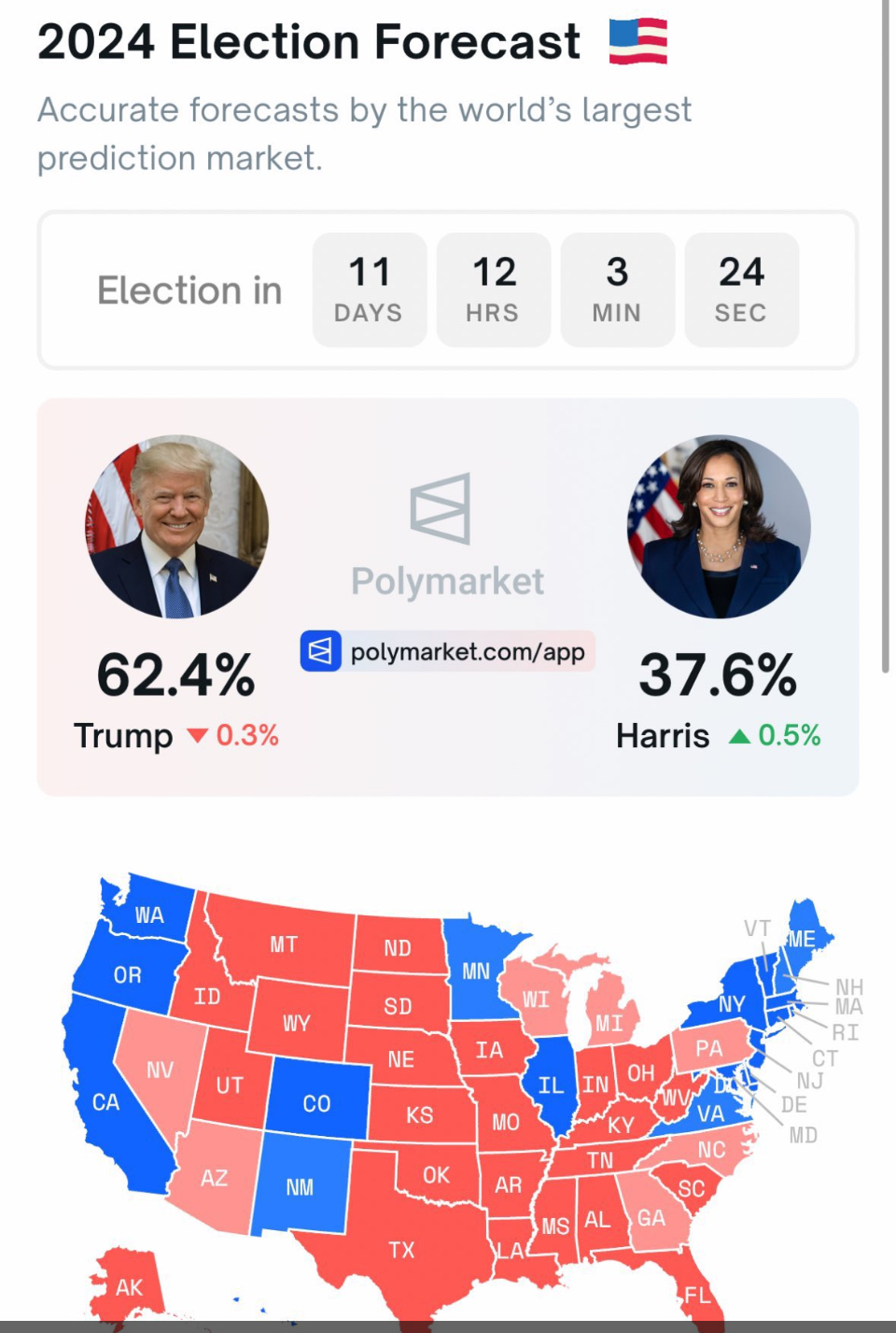 Actualizado com as sondagens publicadas/disponíveis até hoje. Média nacional pelos Harris +1.7%, mercado de apostas pelos Trump 60%-40% chances de vitória. Swing states em zona de empate (ie, qualquer um dos dois pode ganhar o colégio eleitoral, não se vislumbra um favorito evidente).