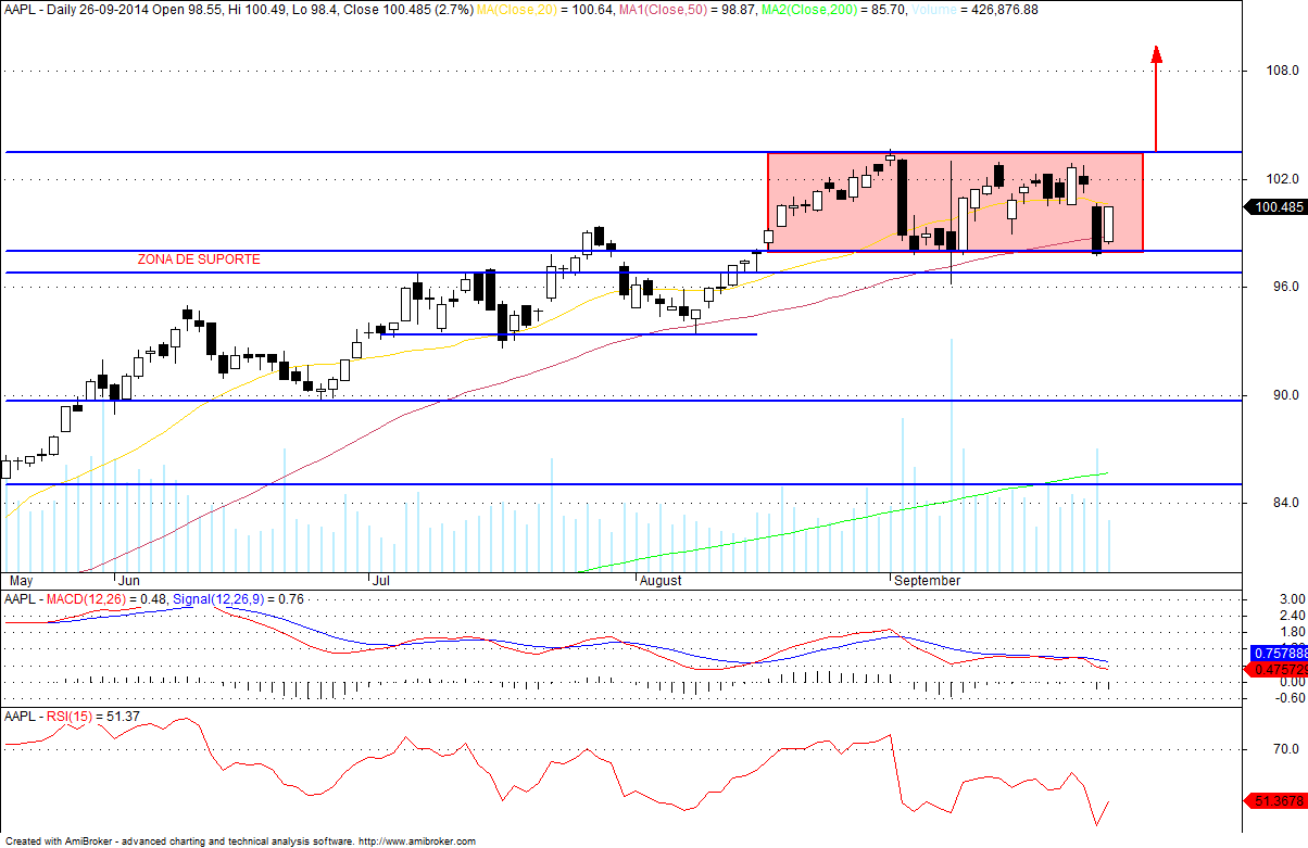 Hoje a AAPL recuperou de ontem, o suporte nos 97.5 aguentou e voltou ao business as usual.
