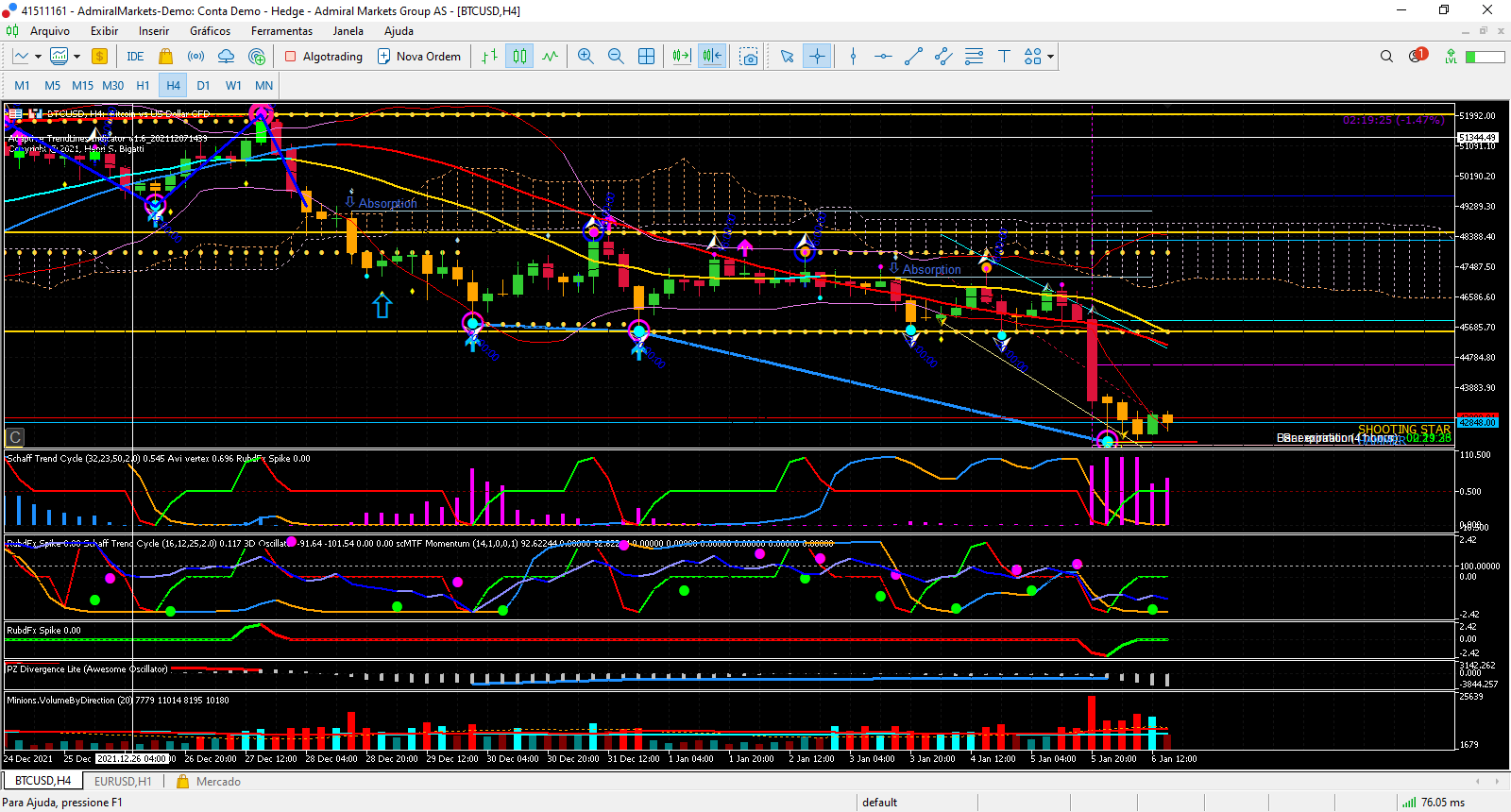 A bitcoin desde 10/11/2021 para ca está bear, tudo indica que assim continue mais algum tempo (para já não sabemos quanto tempo), vai-se vendo, por agora entradas somente em curtos, nos proximos tempos deverá fazer uma correção a tendencia de baixa, tem uma divergencia no grafico 4h, e os indicadores zz mostram positivos, mas a força é pouca para subida.