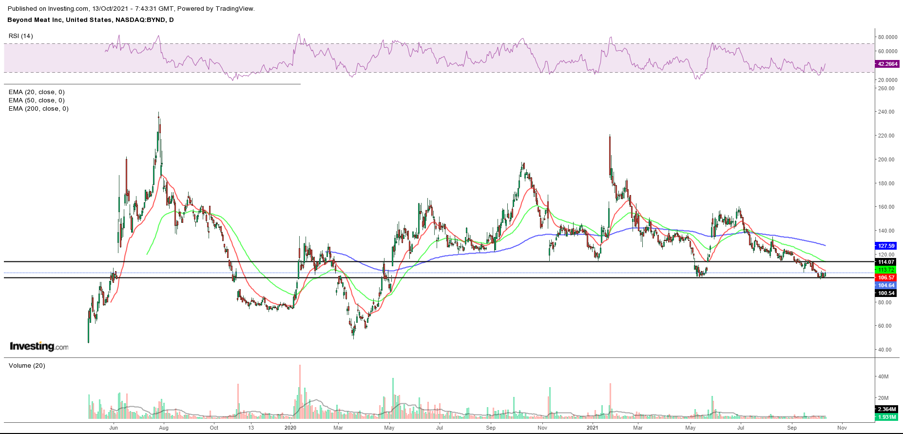 Tem um forte suporte na zona dos $100, que aguentou ação em maio de 2021 e foi novamente testado na passada semana (em fecho).