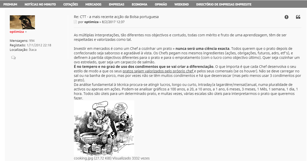 Pior, aquele conteúdo irrelevante e algumas palavras são o contrário do que uso, penso e escrevo sobre mercados "Lagardére", "a beleza está na simplicidade", usar discricionariamente instrumentos de análise, MMS5 ou 25 que nunca usei na vida, um gráfico stockcharts com 3 MMS, quando só coloco 2, nunca deixaria de anexar um gráfico da empresa em análise por um ìndice, procuraria sempre deixar uma análise, uma ideia e não um comentário sem substância, um cartoon péssimo. Foi algum idiota a utilizar o meu nick (foi útil a informação porque vou alterar password).