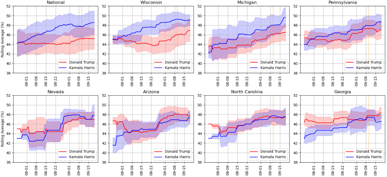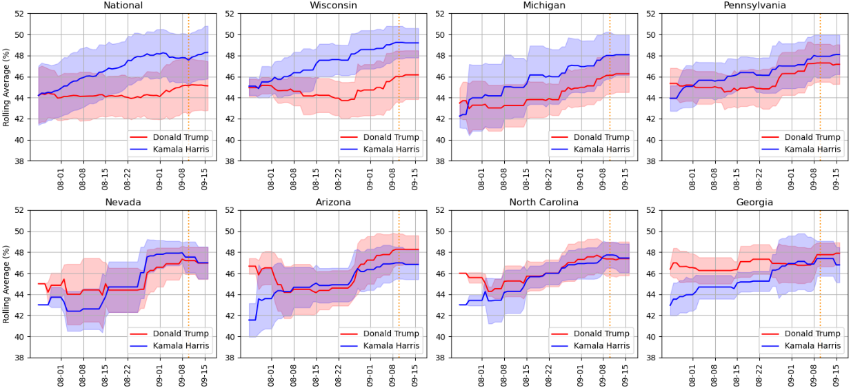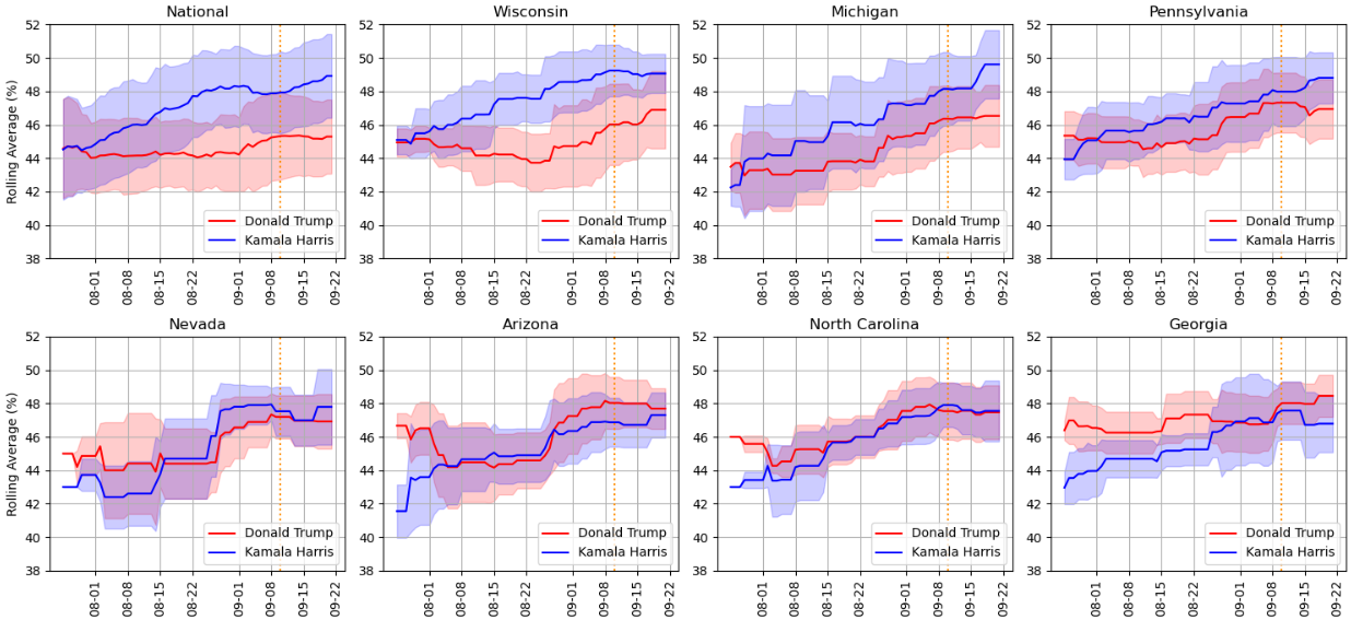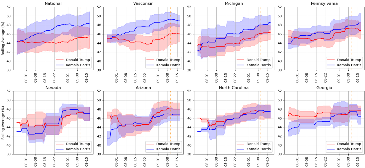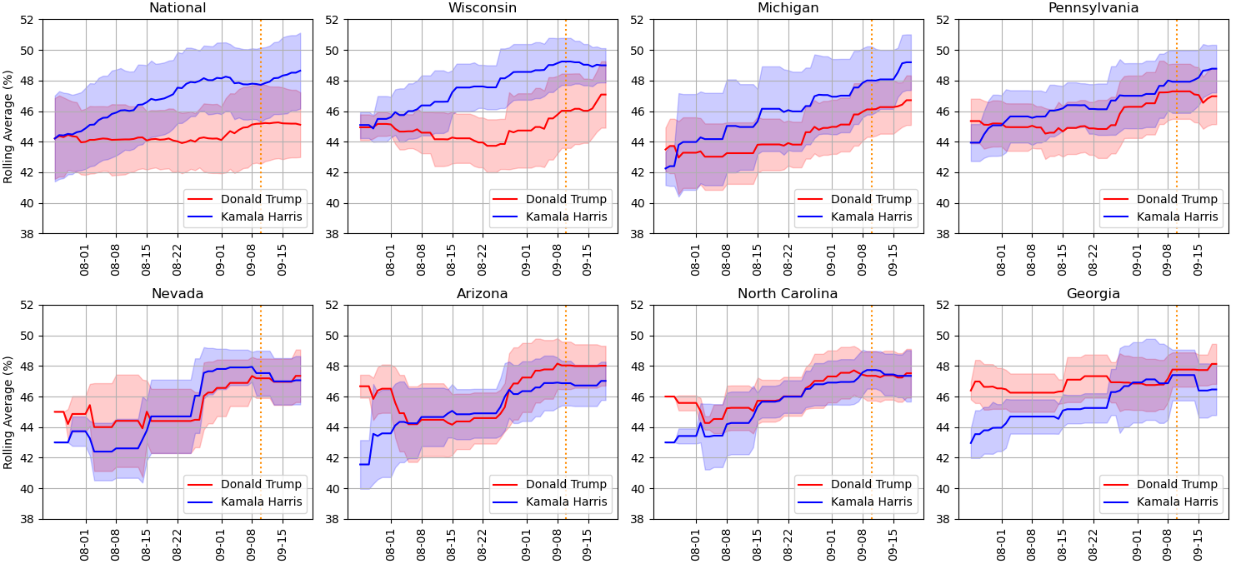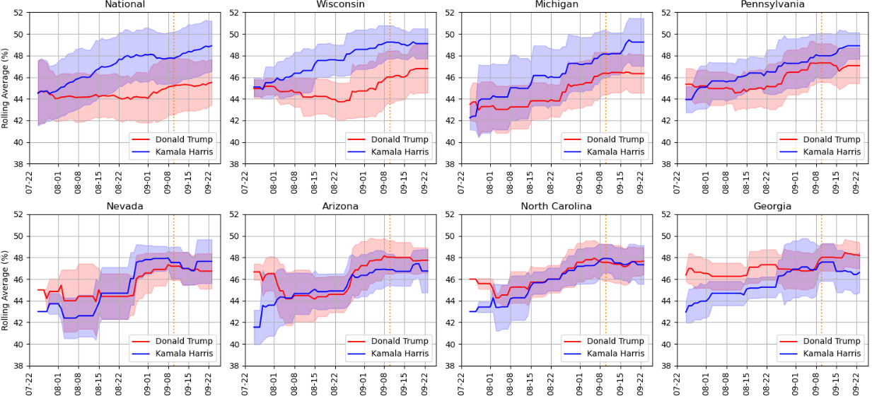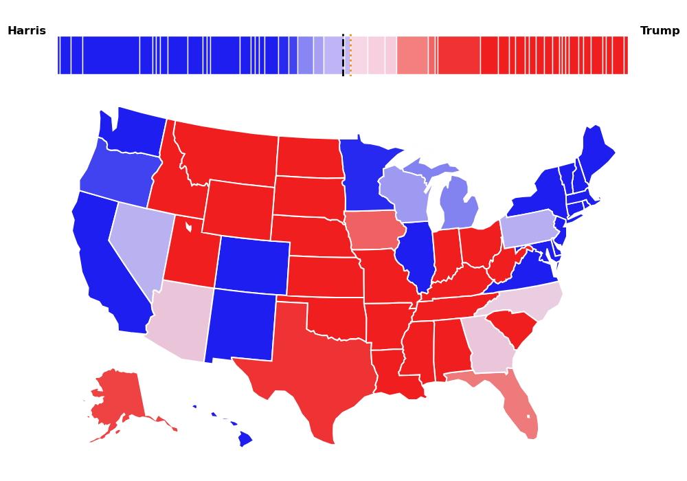 Os swing states ainda estão muito indefinidos e altamente disputados, de acordo com o que é possível aferir pelas sondagens, mantendo a corrida muito próximo de um toss-up. Ainda assim, o panorama geral é ligeiramente favorável a Harris.