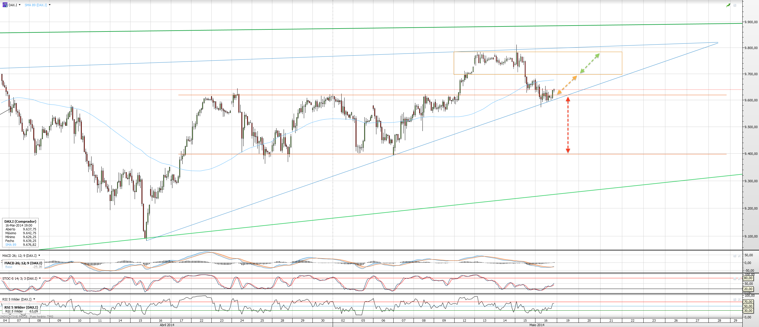 - Neste momento, estamos num range que lhe chamo "limbo", não sei para onde iremos, mas as hipóteses são quebrar a Lta e reentrar no range dos 9620-9400, onde o target óbvio é a base do range, ou realizamos um novo assalto aos 9695 para irmos de encontro ao máximo do ano