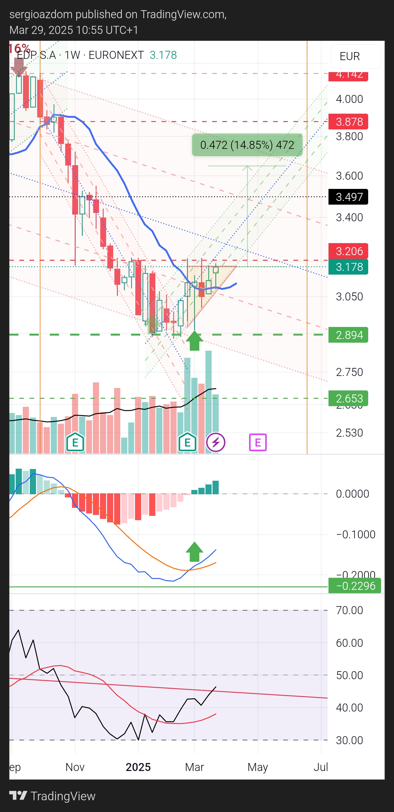 Na minha interpretação, hoje fez finalmente um breakout com mto volume da resistência dos 3.20. O topo do canal descendente está nos 3.60-70, a primeira resistència (anterior suporte) por volta dos 3.50.