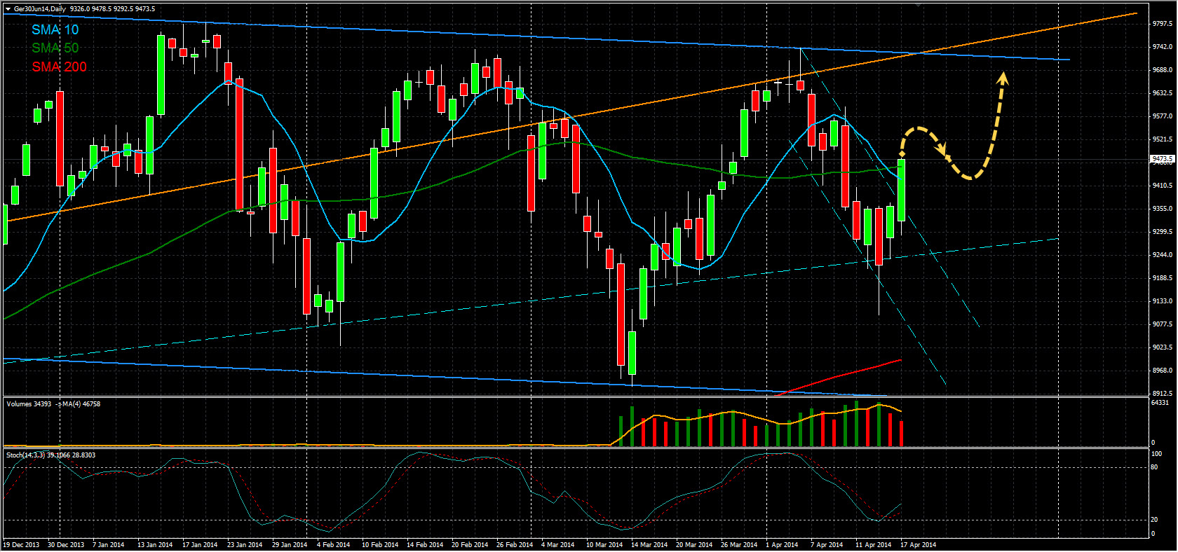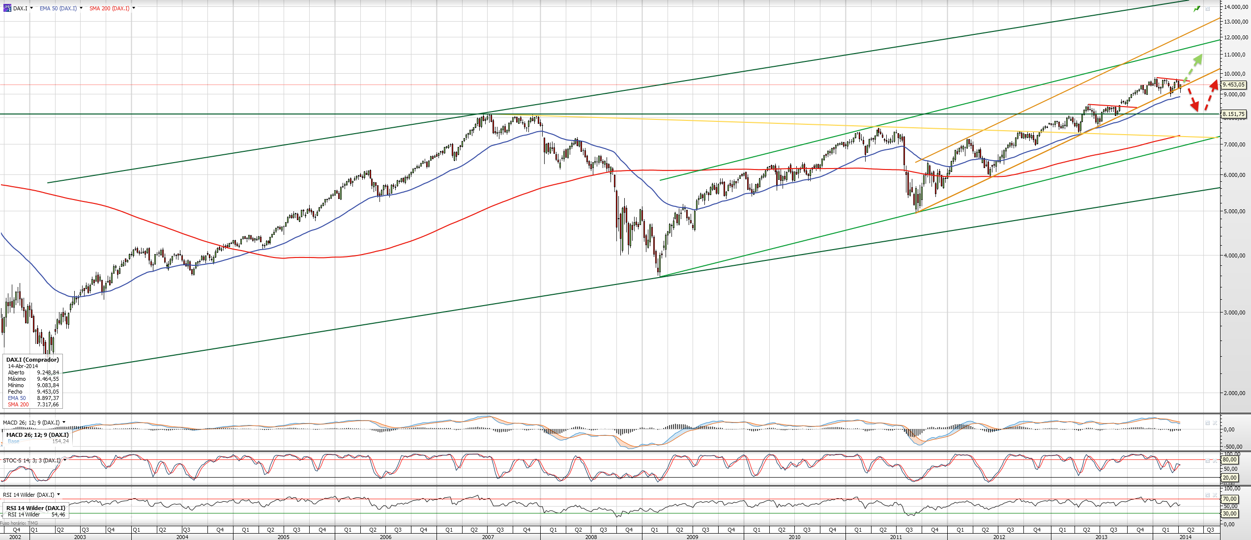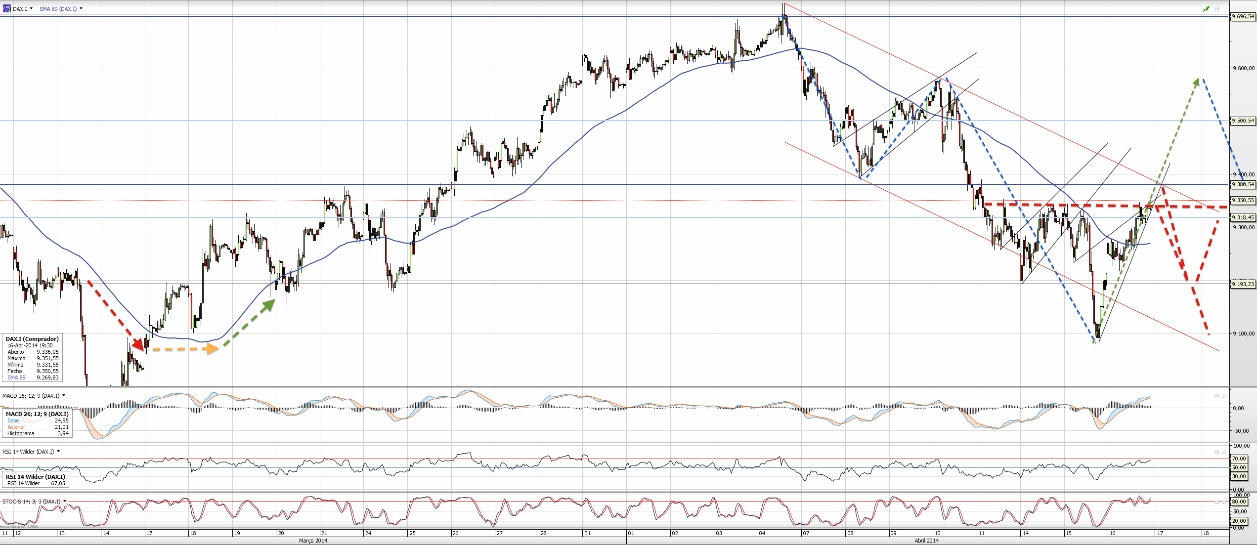 Continuo longo, e colocarei stop profit depois de ultrapassar os 9380 (meu target inicial) e andar por cima dos 9430. A MA a azul traçada costuma dar-me indicação da tendência dominante, e hoje acabou por ficar flat, será que vamos inverter? Em Março tivemos esse comportamento. Daí projectar ainda uma visita aos 9280 antes de subir mais alto se for esse o caminho a tomar.