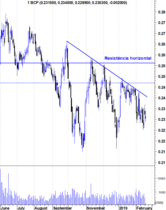 O BCP continua o seu percurso descendente. É uma acção que se os touros voltarem ao "poder" tem um potencial muito interessante mas ainda faltam esses sinais de inversão. O primeiro, de curto prazo, seria a quebra da linha de tendência descendente que vem marcando o ritmo de quedas da acção nos últimos meses. O segundo (ainda que mais ténue) seria a quebra de uma resistência nos 0,247 e o decisivo seria a quebra da resistência na zona entre os 0,255 e os 0,257.