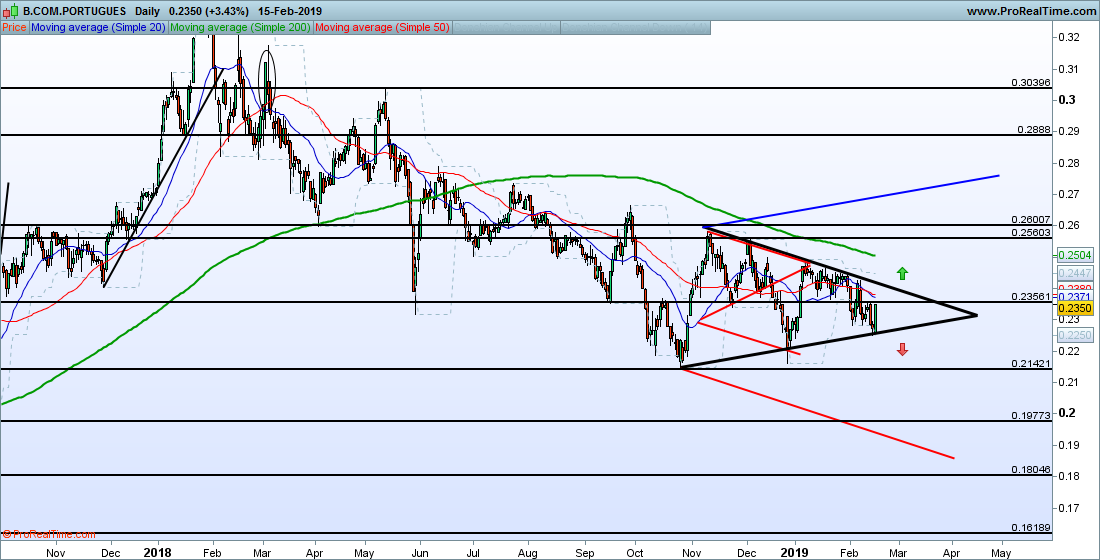 Verifico a formação de outro triângulo simétrico a formar-se no BCP, de maior dimensão, como questionaram e bem, ascendente e não descendente?! Falta saber para que lado vai romper...quando tal acontecer, já teremos algo mais concreto, vamos aguardar