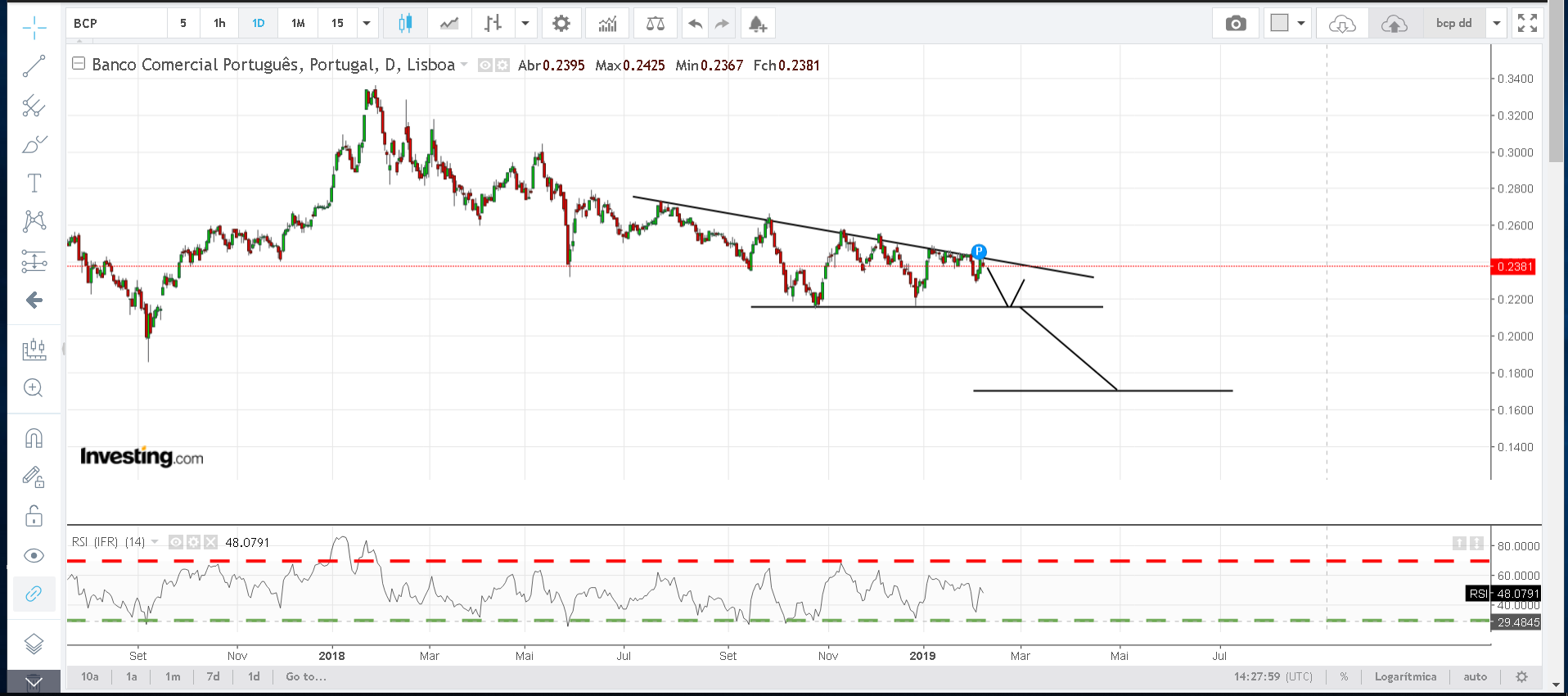 Bcp encontra-se numa zona sem a quebrar a linha a preto e se nao a quebrar arrisca a ir ao suporte pelos 0.21xx aproximadamente e ai é que serão elas se o quebrar BCP irá visitar os 0.17 que será o target de uma figura quase perfeita de um triângulo descendente....