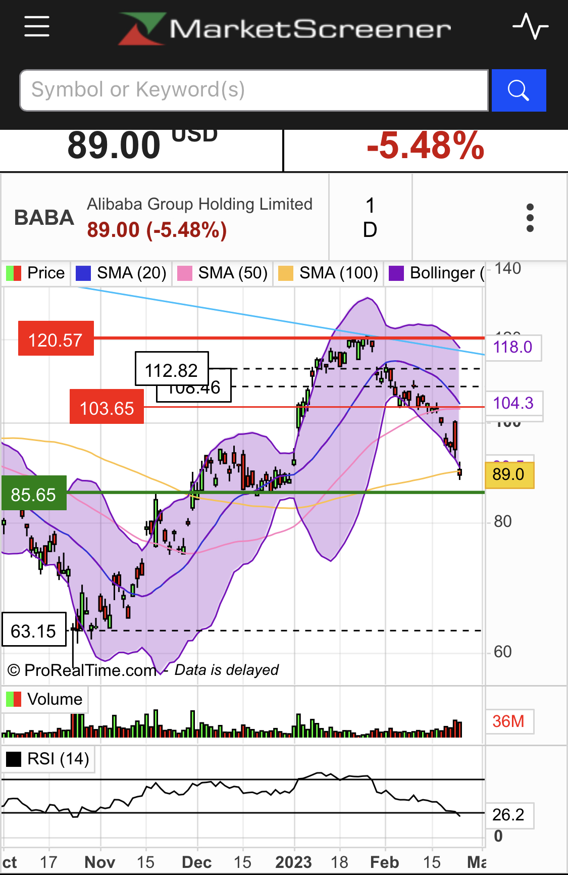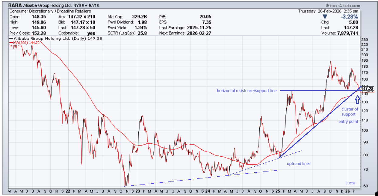 a alibaba encontra-se a testar um cluster de suportes constituido pela sua média móvel de 200 dias pela sua uptrend line e pela sua linha horizontal de resistência/suporte em torno dos $145 pelo que esta zona será um bom ponto de entrada nesta cotada.