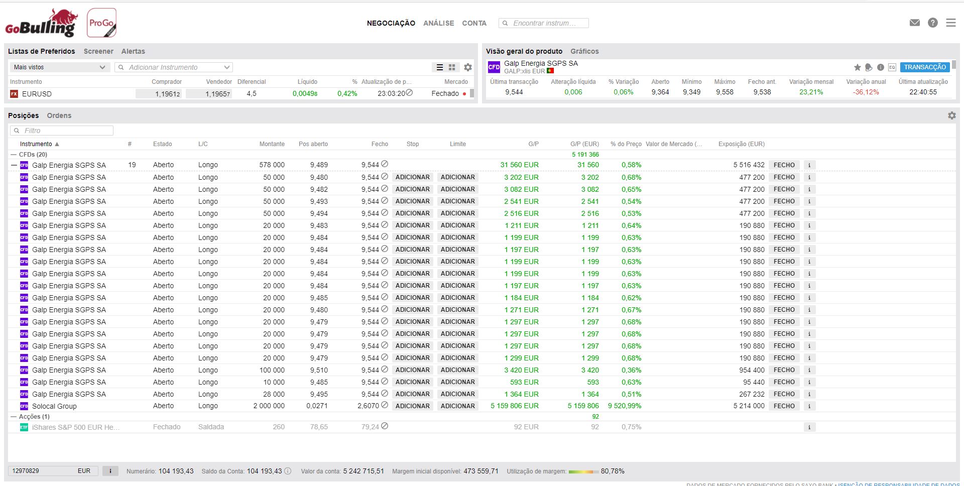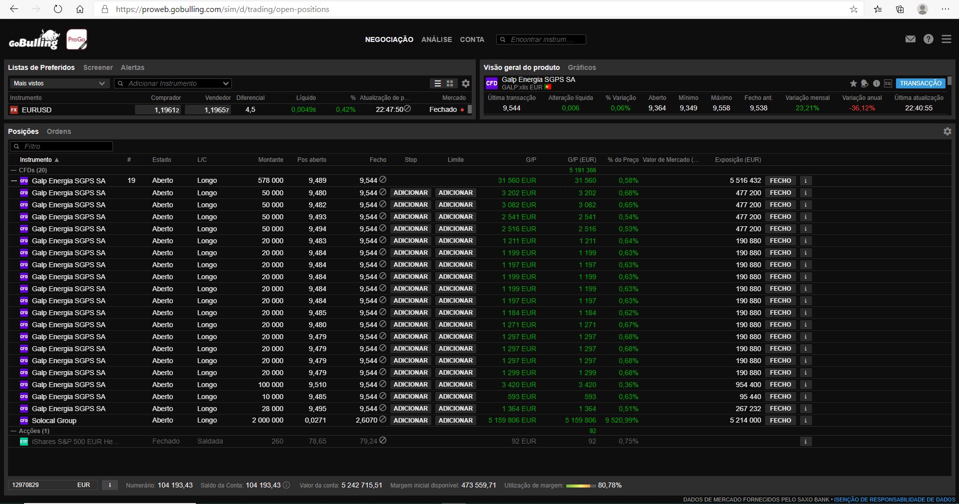 No entanto, a conta de demonstração não permite refletir estes eventos de uma forma automática, pelo que a sua conta gerou um montante muito elevado e que não traduzia minimamente a realidade. Adicionalmente, essa situação permitiu-lhe alavancar um investimento em CFDs da GALP, antes da implementação do evento naquela empresa Francesa. Acresce ainda que a maior volatilidade com a depreciação da GALP deveria ter sido registado um Stop/Close-Out da sua posição colocando-a em valor reduzido e disfuncional.