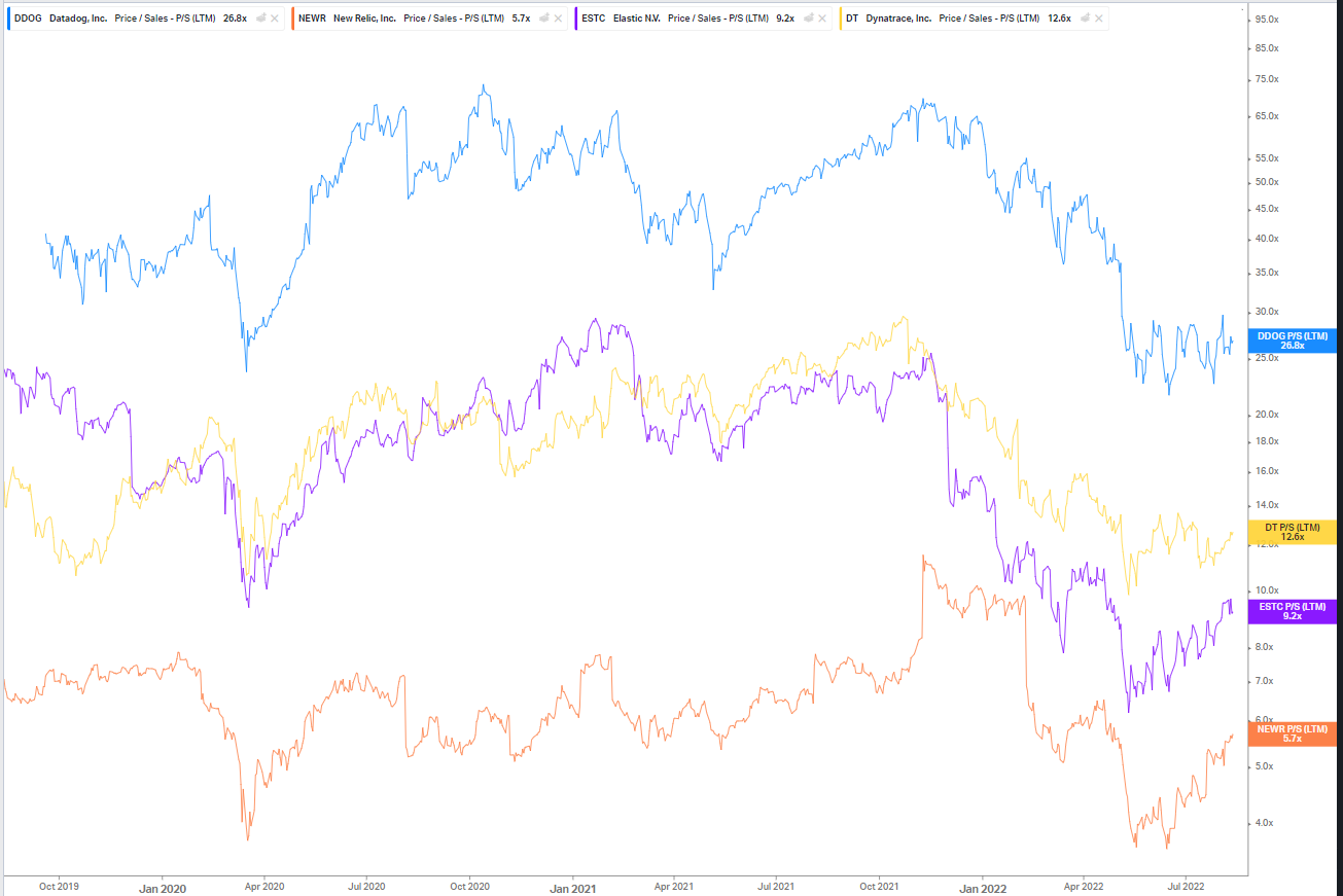 Decidi criar um pequeno índice (ETF fictício) composto com as empresas que mencionaste, retirei a IBM que apesar de ter um produto deste segmento, continua a ser um gigante do setor, e acrescentei a New Relic que também me parece focada no segmento de Aplication Performance Monitoring and Observability