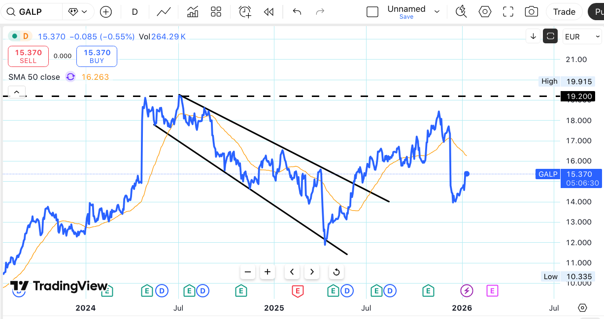 Sobre as cunhas, foram desenhadas a primeira vez no ano passado ou no início do ano, com exceção da EGL e da COR. Algumas desenhei cedo de mais, mas às vezes é difícil ver quando a subida vai começar. Apenas ajustei os objetivos porque usei gráficos ajustados por dividendos. Na COR, a cunha atual é diferente da que tinha antes. Na anterior usei o gráfico ajustado por dividendos mas agora preferi o não ajustado, mas a direção aponta no mesmo sentido.