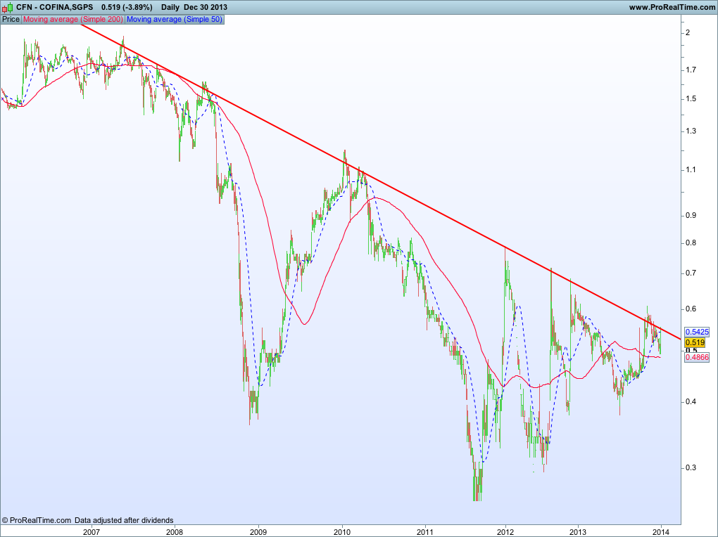Tenho olhado para a Cofina como uma alternativa para diversificar a carteira, mas ainda a vejo semi-bearish. Embora apresente mínimos relativos superiores, estes estão dentro do triângulo. Sendo o triângulo uma figura típica de continuação de tendência, não será de esperar quebra em baixa?