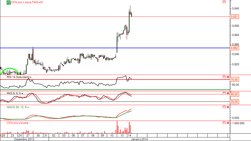, mas enquanto continuar este volume com velas diárias "catitas" tem condições para subir ainda mais. Se a LTd for realmente quebrada e posteriormente a resistência nos 0,70€ considero que a Cofina entrou em Bull Market, e se assim for o ano de 2014 seria potencialmente bastante positivo.Agora nos mercados, como sabemos, temos sempre que esperar todos os cenários possiveis, reteste à LTd, falso breakout, ir directo à resistência, lateralizar, etc.