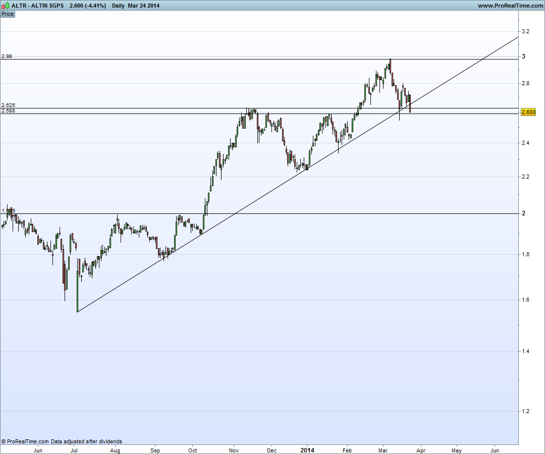 È assim que vejo a altri, não muito confiante, porque ontem penso ter sido uma prova que no curto prazo pode vir a visitar outros valores mais abaixo!! Ontem com bom volume, foi das cotadas que mais desceu no psi 20. hoje com algumas em alta, a altri não consegue ter "força" para avançar!! Depois no meu ponto de vista ter quebrado suporte e LT, penso que a quebra ( dos 0.60 ) pode trazer uma queda mais grave!! Falo dos 2.60, simplesmente por ser mesmo numero redondo, porque não se encontra rigorosamente nada neste valor!! Hoje com uma subida ligeira, o volume não agrada em nada, motivo de preocupação!! Desfiz a minha posição hoje, bem ou mal, está feito!! Vou aguardar os proximos dias e esperar que recupere a confiança!! fica o gráfico....abraço e boas apostas