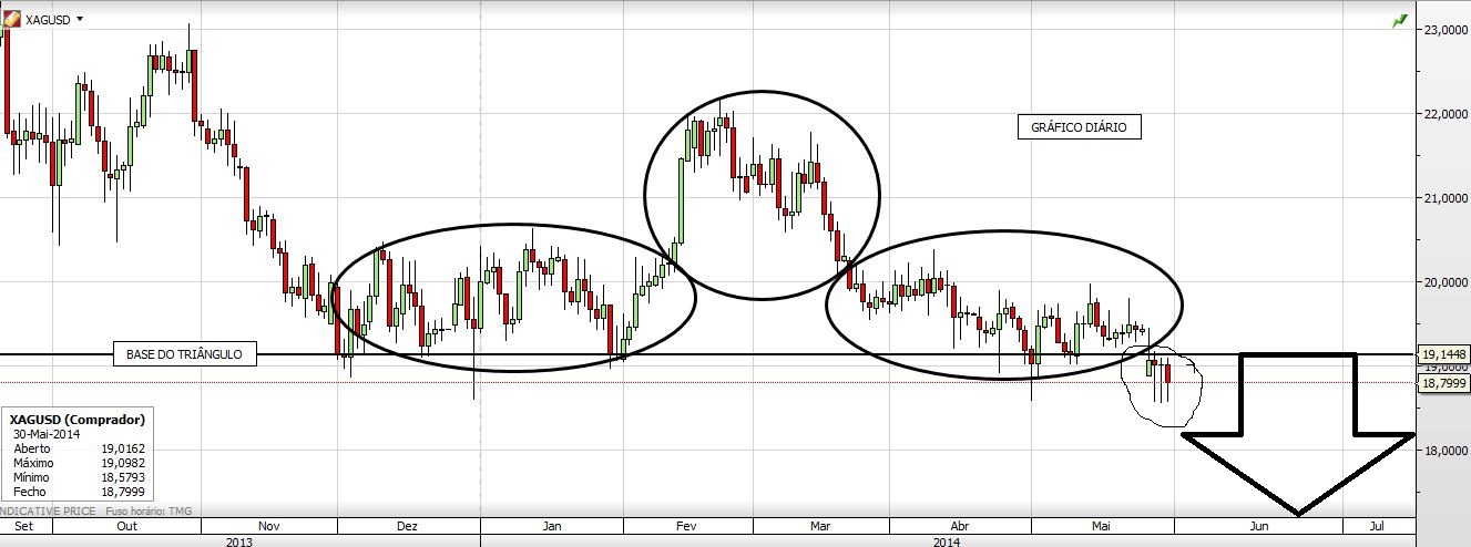 As últimas 4 velas no diário encerram o pormenor curioso de que em quase 4 anos a Prata nunca fechou mais do que duas vezes abaixo da linha que representa a base do triângulo. Será este um pormenor relevante ou apenas um apontamento de circunstância? De qualquer maneira creio que o rumo é claro.