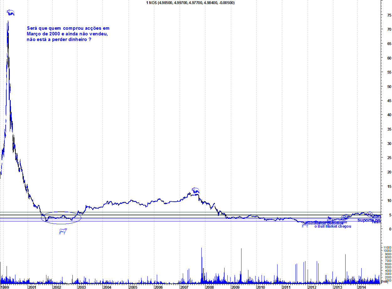 Tal como foi referido, em termos de longo prazo a acção mantém um “Bull Market”, e agora tem estado consistentemente acima da zona de resistência dos 4,87, que para mim passou a suporte. Com a movimentação de hoje deve ter força para testar uma "suposta" zona de resistência dos 5,20;5,40. Que dizem?