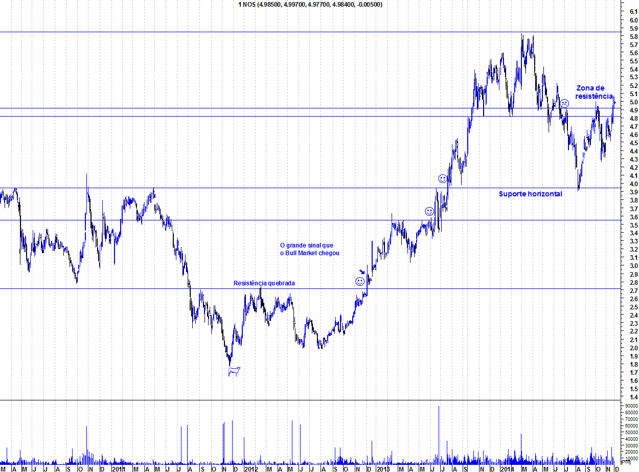 Recorde-se que a Nos nasceu da fusão entre a Zon Multimédia e a Optimus e os elementos do activo e do passivo desta última integraram a Zon, sendo atribuídas acções da Zon aos accionistas da Optimus. Por esse motivo, faz sentido analisar o gráfico da Nos como a continuação da evolução das cotações da Zon Multimédia.