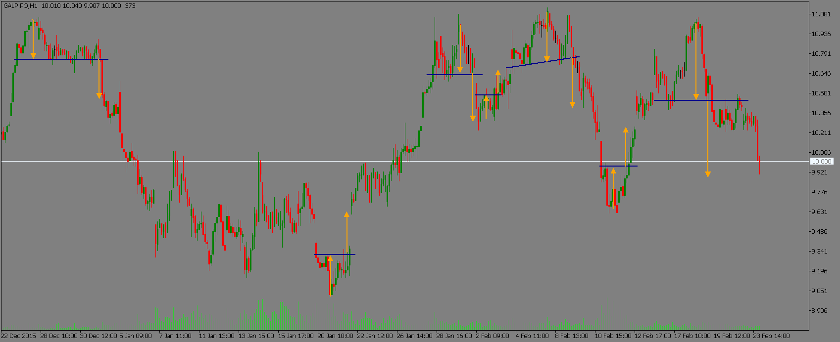 A Galp continua a fazer as maravilhas dos Swingtraders, pela enorme linearidade técnica que mantém no gráfico horário. Desde o início do ano que isso tem sido de sobremaneira evidenciado, pela sequência de 7 padrões de inversão consecutivos a serem activados e a atingirem a projecção. Bem, seis, se considerarmos que o iniciado em finais de Dezembro acabou por ser seguido de uma consolidação. Ainda assim, e de acordo com esta sequência, será assim expectável que a projecção do último padrão (9,88€) seja atingida. E, eventualmente, que um novo rally ascendente seja originado por um novo padrão de inversão.