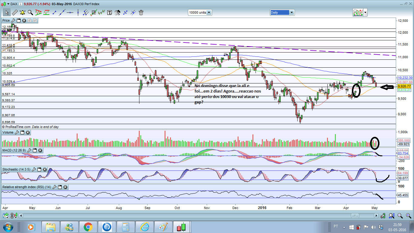 Outra coisa interessante são os futuros nos States estarem a ficar verdes. O RSI do DAX aproxima~se do sobrevendido e as velas diárias mantem-se logo abaixo da MM50.