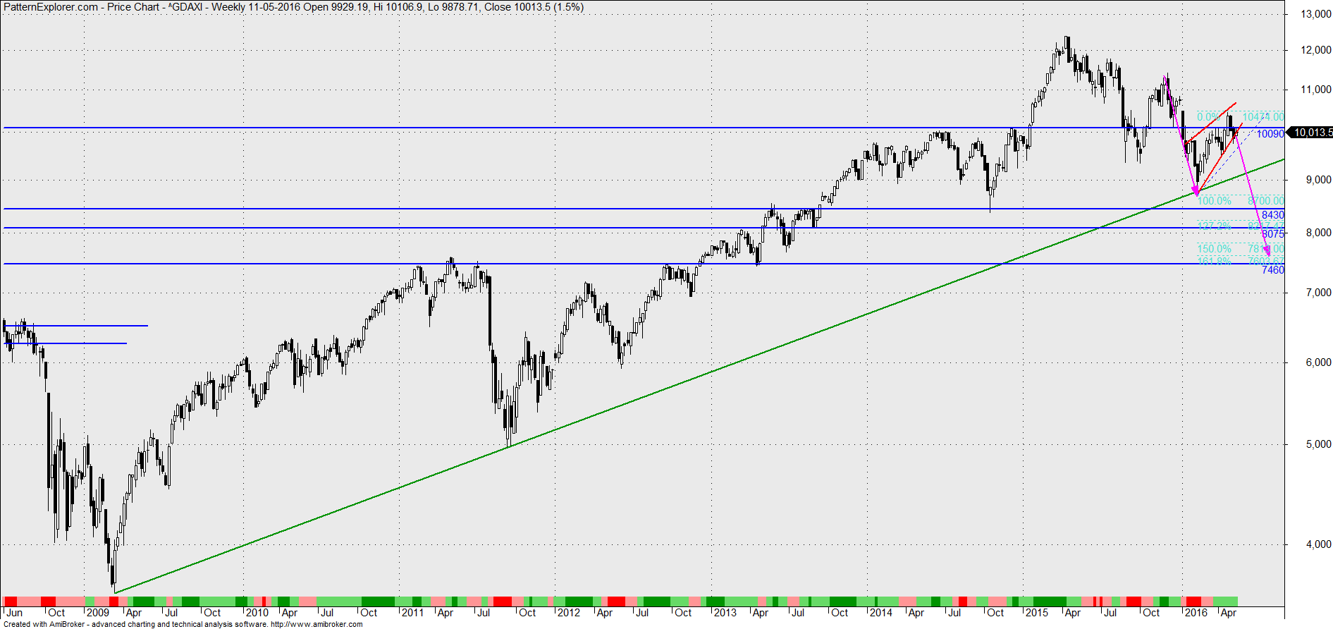 Olhando de soslaio o gráfico diário, vejo nos futuros DAX um bearish engulfing e no cash uma evening star e um suporte primeiro nos arredores dos 9800 e depois os famigerados 9500.
