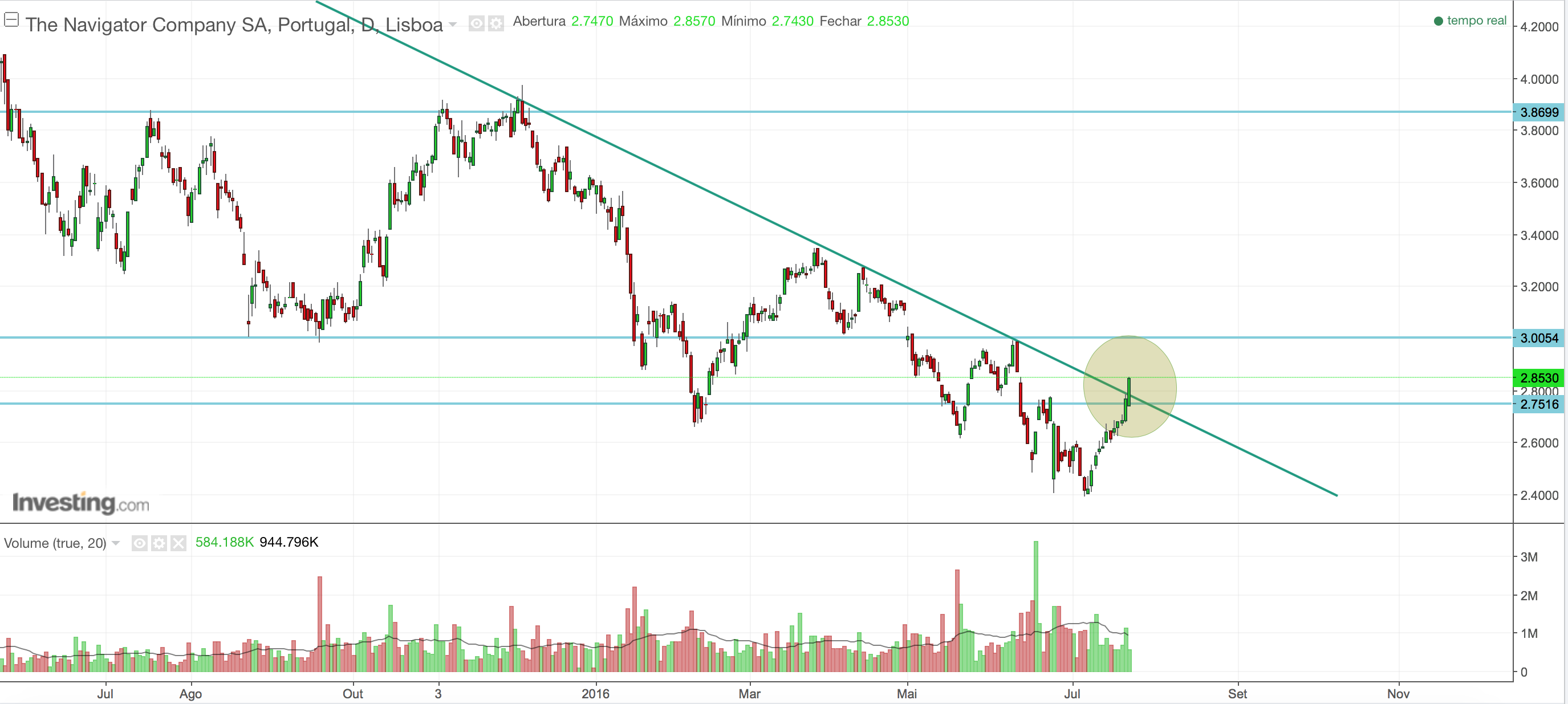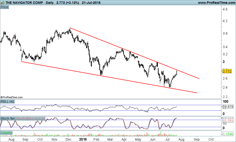 Aproveito para deixar o meu gráfico actualizado da Navigator, numa altura em que está no topo da 'falling wedge' depois de uma boa reacção à base e um belo rally.