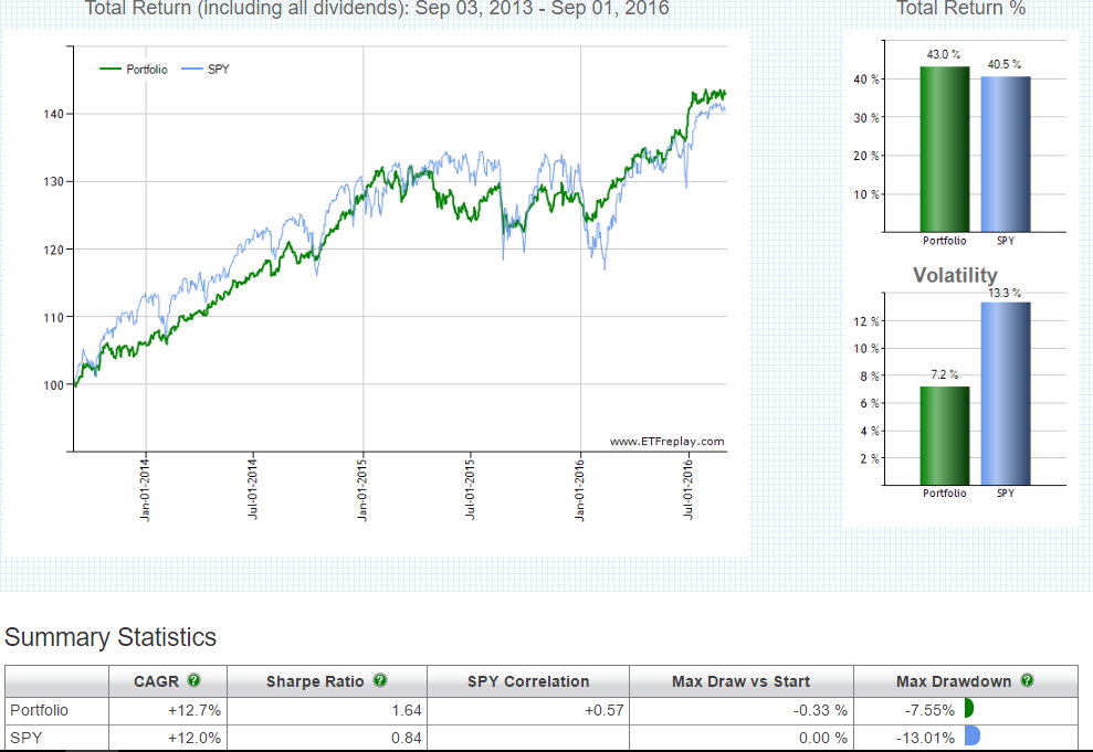 A verdadeira volatilidade da carteira 50% TLT/50% SPY (sem rebalanceamentos) nos últimos 36 meses fixou-se sim nos 7.2%. Podemos ver o diferencial entre os 13.15 e os 7.2 como a baixa de volatilidade devido a diversificação.