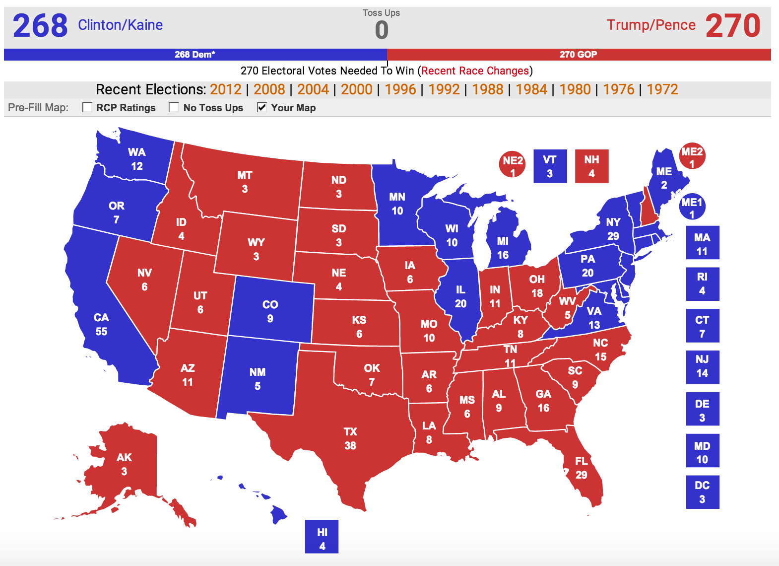 sendo que, em comparação com o mapa "No Toss Ups" do Real Clear Politics apenas altero o New Hampshire.