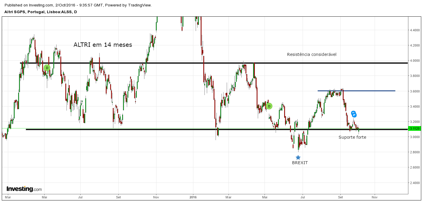 Observando os últimos 14 meses - que, recordo, não foram favoráveis à bolsa portuguesa: e com isto sublinho que o comentário radica de uma base pessimista - diria que a ALTRI , apesar de fixada em terreno perigoso (em cima do suporte dos últimos 2 anos) está graficamente apetecível.