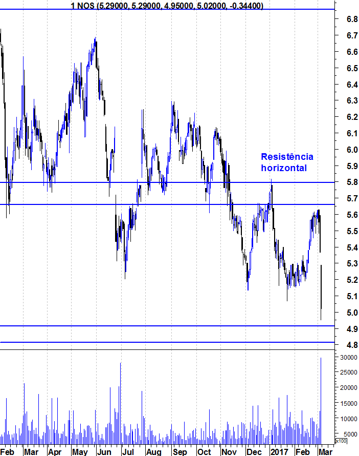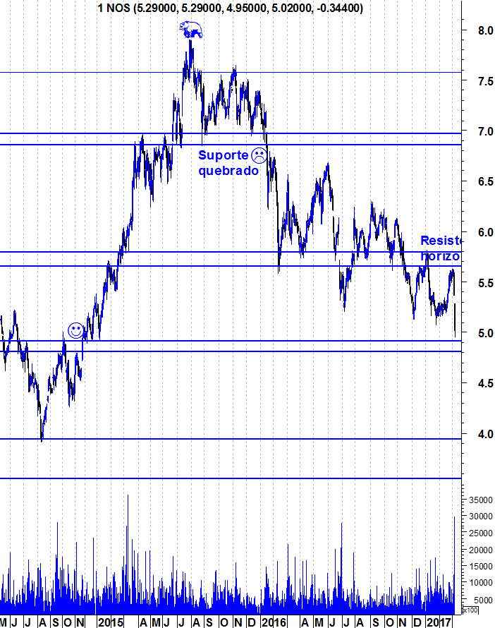 Depois desta queda forte a NOS parece estar a querer estabilizar a negociação na base de suporte 4.95 - 5