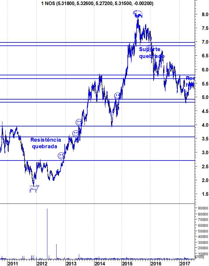 RFPB, as análises que aqui deixo são de médio e longo prazo e, para mim, nesse horizonte temporal a zona entre os 5,65 e 5,80 é a decisiva. Por um lado, porque em 2017 a Nos não conseguiu superar essa zona. Depois porque foi a zona que suportou a acção em Fevereiro, Março, Abril, Agosto e Outubro de 2016. Por isso, para mim, é uma zona de enorme importância.