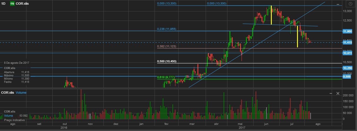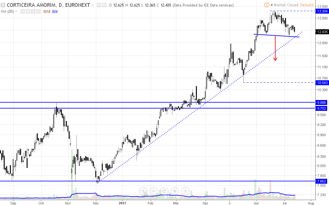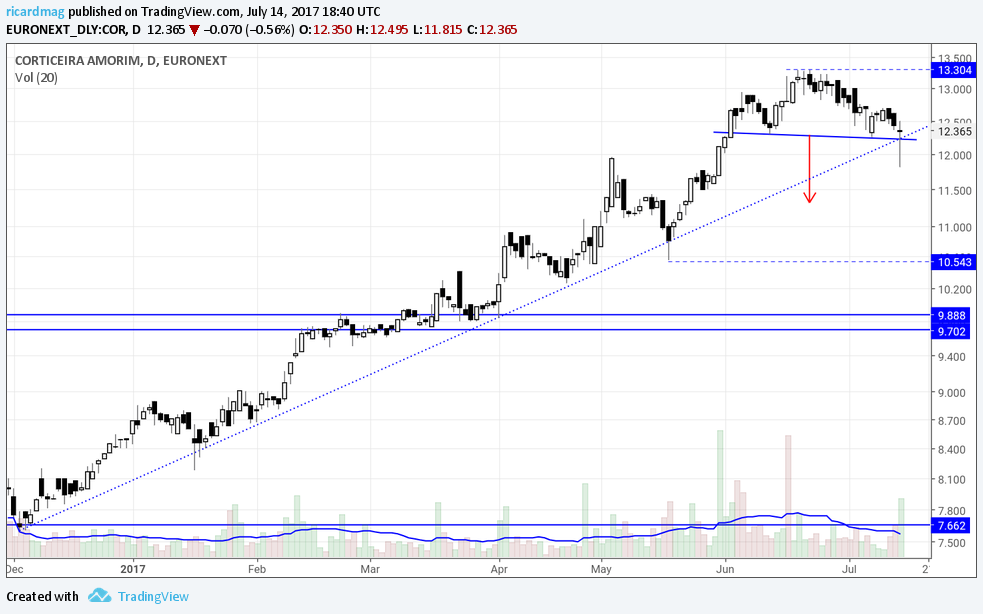 Bom, hoje tive que ser disciplinado e fechar a posição que tinha há mais de 8 meses na Corticeira com base na minha forma de estar neste mundo da bolsa, a AT. O gráfico diz-me que pelo menos uma retracção mais forte que o usual é provável, pelo menos até ali à zona dos 11€, onde não me importaria de reentrar caso desse sinais para isso. Ou até mais abaixo, quem sabe voltar aos 10€. Ontem, com bastante volume, quebrou a neckline de um H&S e hoje quebrou um suporte que considero importante igualmente com forte volume, fechando quase em mínimos da sessão. Ainda fiquei à espera que pudesse fazer um martelo na recta final mas não aconteceu, pelo que nestas coisas não se pode ter amor às acções, apesar de ser uma empresa de que gosto bastante pelo que conheço dela. Vou acompanhando para tentar um dia reentrar.