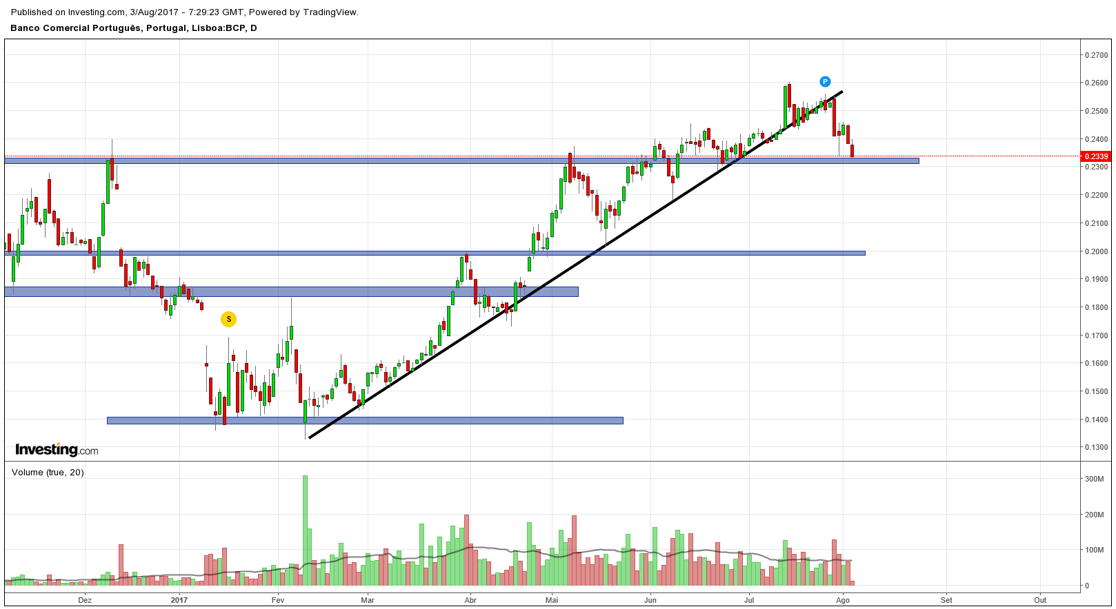 Se amanhã recupera tudo bem , se continua a cair , o suporte dos 0.23 no BCP provavelmente poderá ser muito frágil e visitar níveis inferiores .