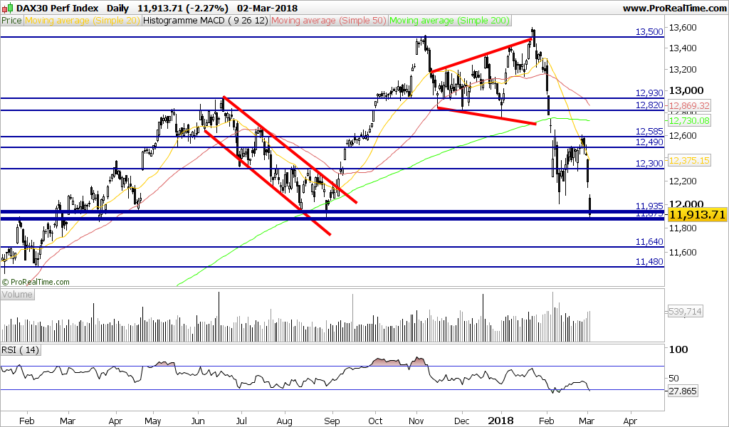 Inicio de semana atribulada e pouco habitual com futuros DAX em forte queda nos 11750 Pontos e abaixo do forte suporte 11900 e DOW a cair 200 Pontos
