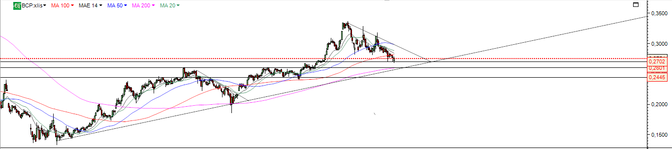 Pela análise técnica o BCP está na " no man's land ". Tanto pode cair como subir, mas está longe de suportes ou resistências.