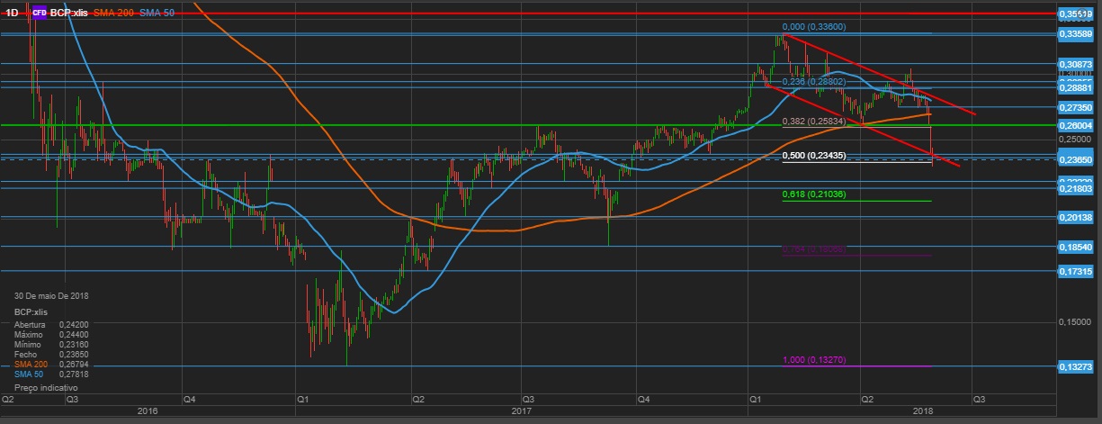 Quanto ao BCP, apenas chamo a atenção como nota de curiosidade para esta zona dos 0.24 (mais coisa menos coisa). Tecnicamente, para além de suporte óbvio, corresponde aproximadamente à retracção de 50% do movimento entre os mínimos de sempre e o máximo deste ano (0.239), tal como à retracção 61.8% entre os mínimos de setembro de 2017 e os máximos deste ano (0.247). Se hoje fechar abaixo desta zona, considero que o Bull pode ter ficado para trás.