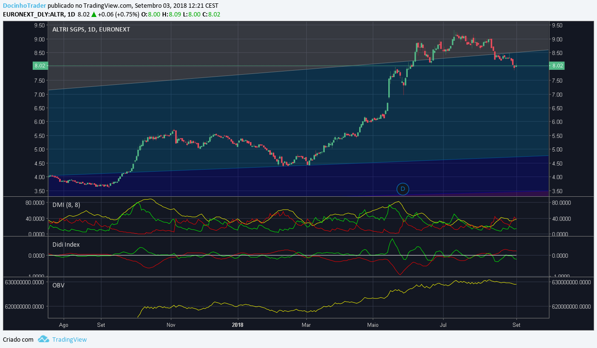 A Altri retomou a sua trajectória ascendente nas últimas 2 semanas. A acção vive um poderoso "Bull Market" que fez a sua cotação triplicar nos últimos 2 anos e meio. Com subidas tão expressivas, as retracções são violentas, mesmo sem colocarem em causa a sua tendência ascendente de longo prazo. Para já, é importante que a zona de suporte nos 7,7 euros se mantenha intacta para os touros continuarem no controlo da situação em todos os horizontes temporais.