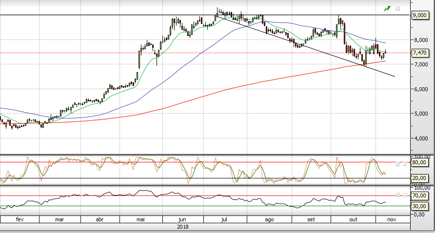 Esta desde máximos está com uma correçao a rondar os 20 por cento se é que podemos chamar a isto correção,deu um primeira sinal de fraqueza ao quebrar os 8 em baixa ,encontra-sse agora entre os 7 suporte e os 7,40 zona de alguma resistençia e a bola está agora do lado dos ursos que a vão jogando entre eles mas não a passam aos touros.