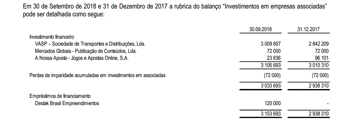 Em 30.09.2018 o valor inscrito em investimentos financeiros na nossa aposta tinha a valorização de 23 mil euros