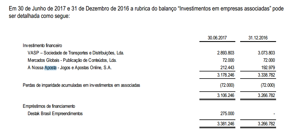 O valor da participação financeira do jogo online diminuiu de 200.000 euros para 23.000 euros no ultimo trimestre , desvalorizou para já o investimento em 177.000 euros.