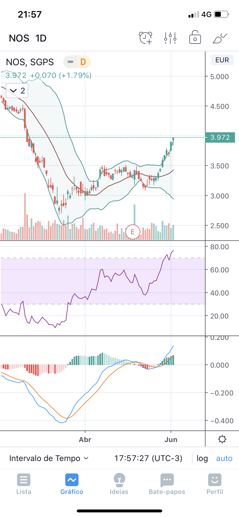 O que verifico são a zona dos €3,40; €3,50 como resistência nos últimos 2 meses, e, essa sim será a zona suporte no imediato.