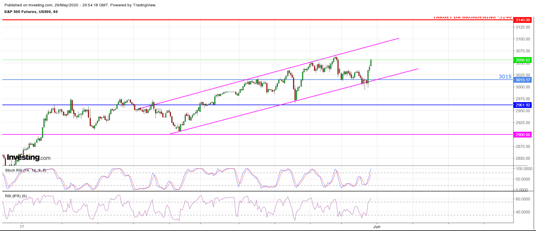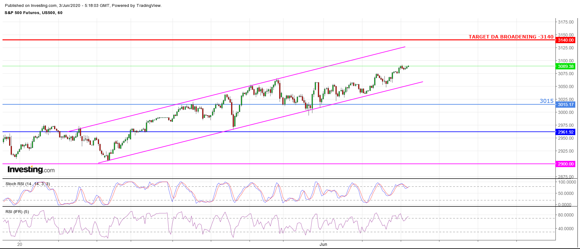 Há uns tempos atrás (quando parecia que era o dilúvio) falei numa broadening wedge descending que tinha um target nos 3130
