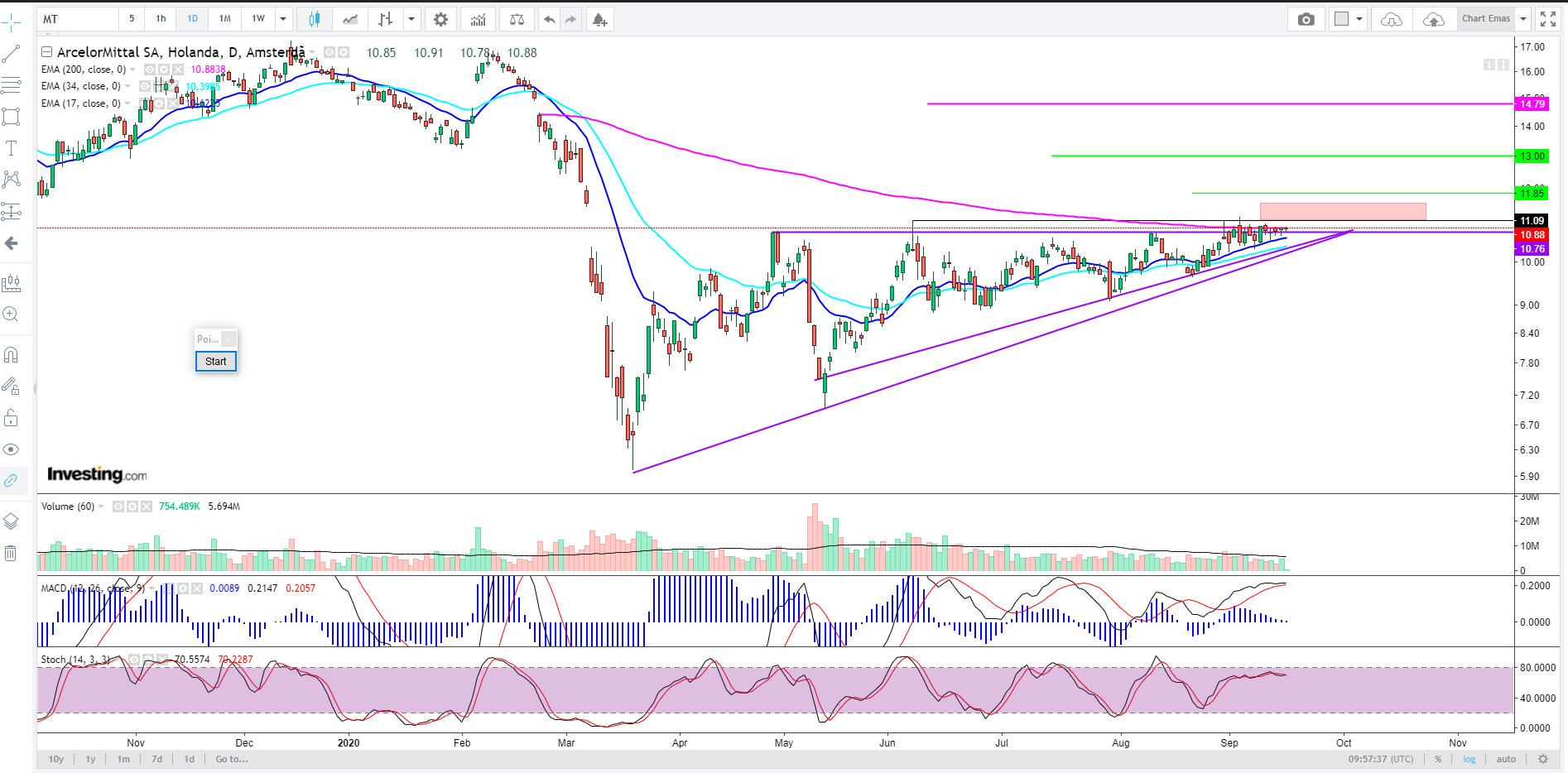 A Arcelormittal está a preparar novo ataque à resistência dos € 10,72. Já lá foi 3 vezes no pós pandemia e não conseguiu romper. Veremos se é desta.